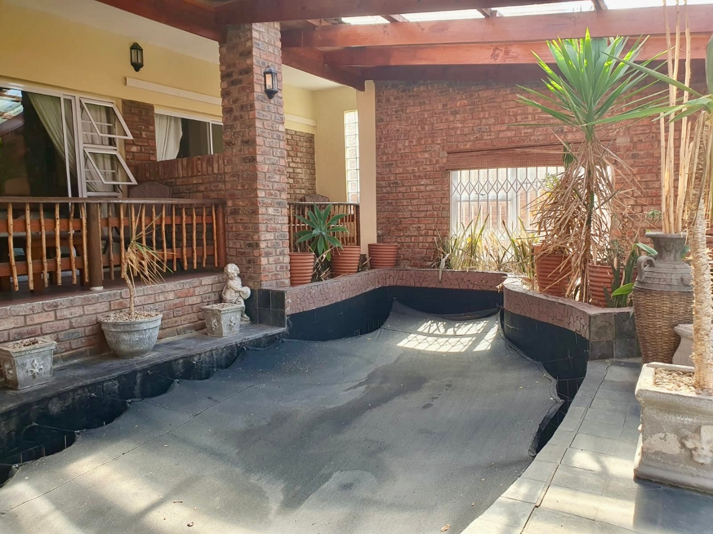 - Covered swimming pool, surrounded by established gardens