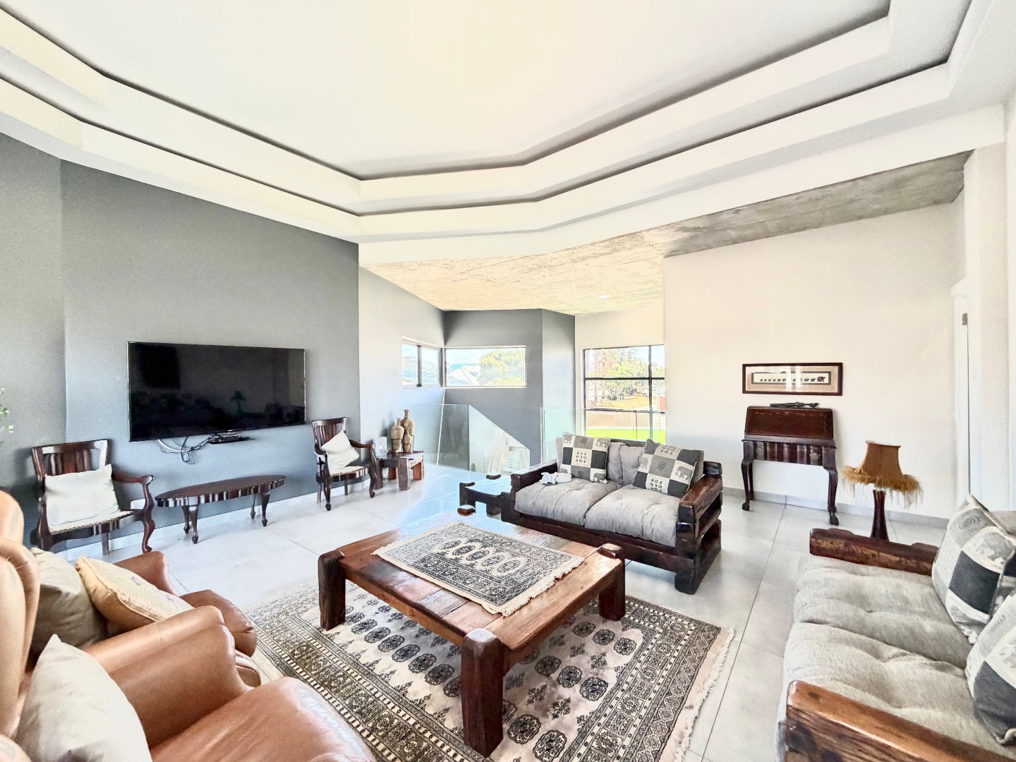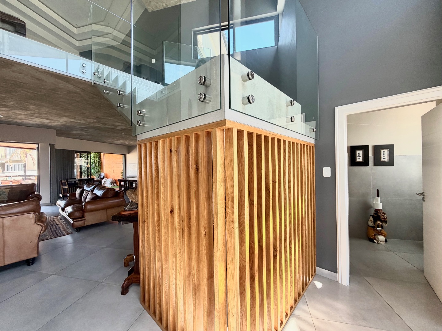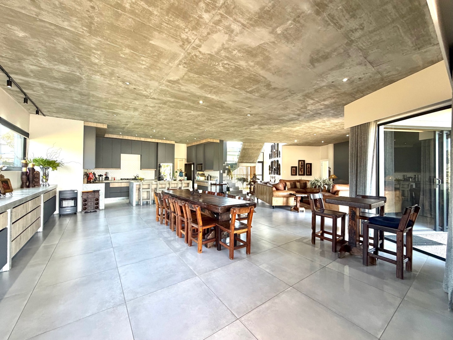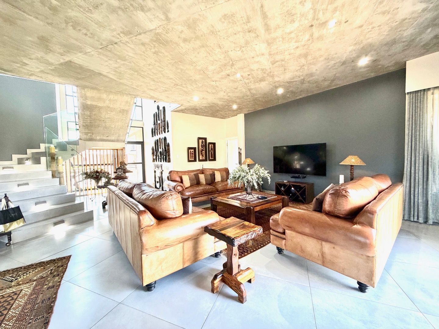 Step inside to discover a spacious 405 sqm interior designed for modern living. The open-plan layout seamlessly connects lounge, a dining room, and kitchens, including a practical pantry. High ceilings, some with an industrial-chic concrete finish, and large windows flood the space with natural light. A striking glass-railed staircase adds a touch of elegance, while durable tiled flooring flows throughout.