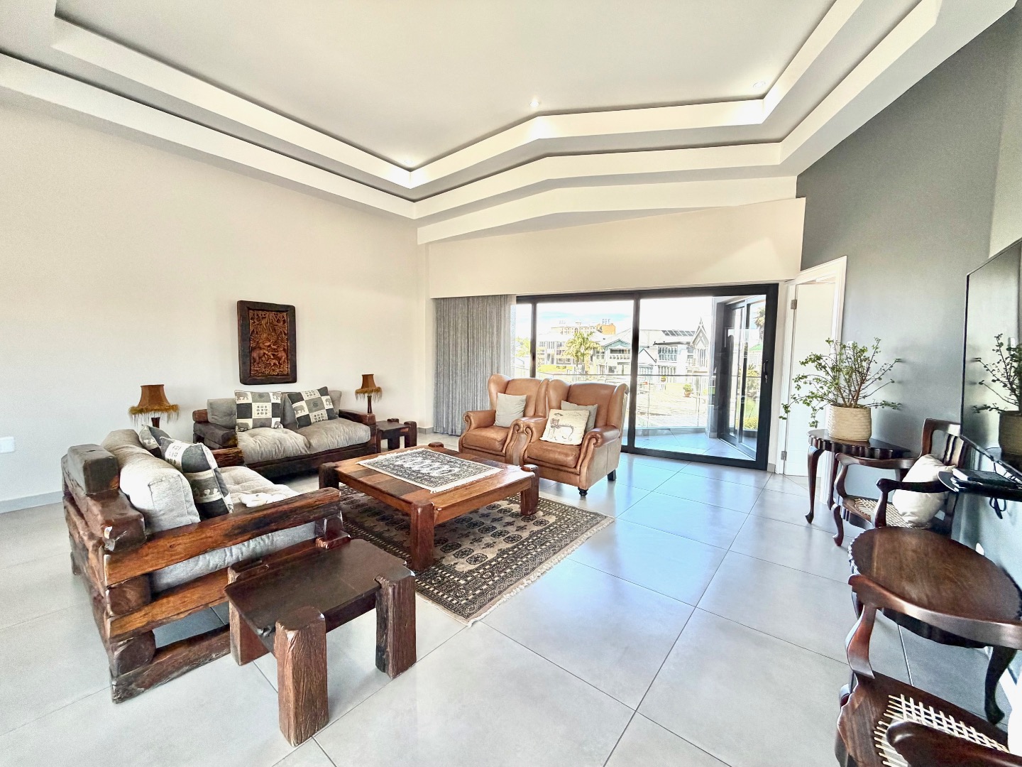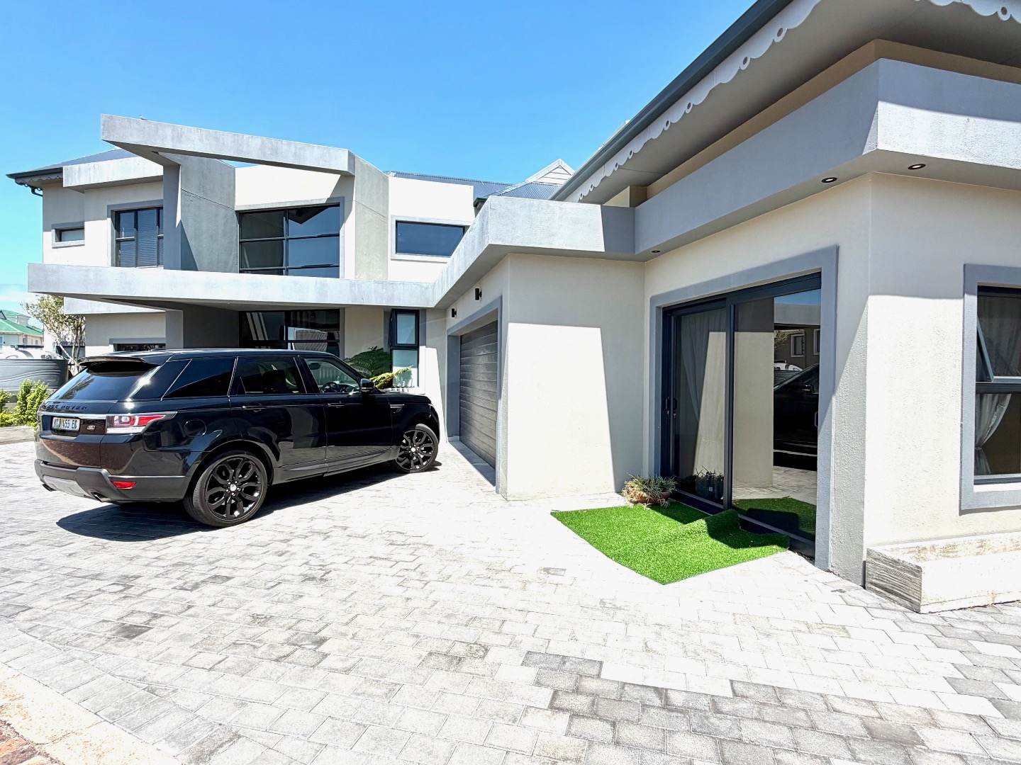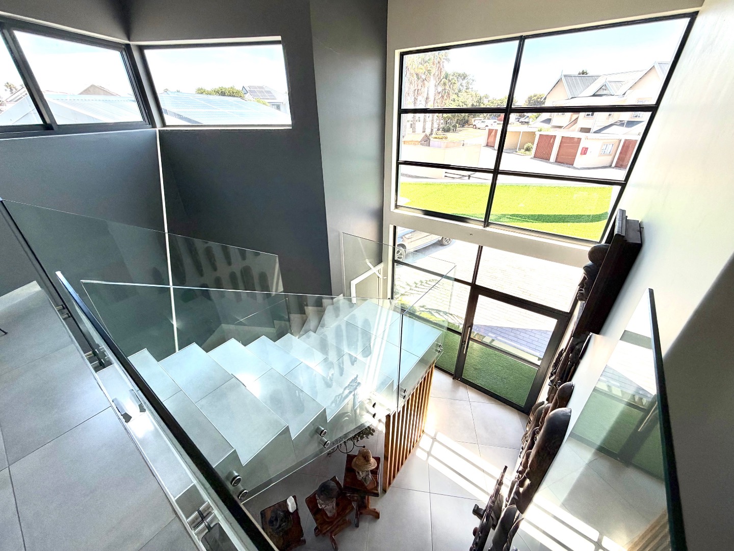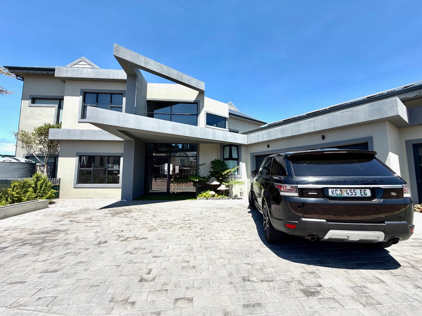This modern two-story residence in Marina Martinique, Jeffreys Bay, presents a striking first impression with its contemporary grey and beige facade and unique angular architecture. The property boasts a double garage, paved driveway, and established landscaping featuring palm and aloe trees. Sustainability is key, with solar panels adorning the roof and visible water storage tanks, complemented by a battery inverter system.