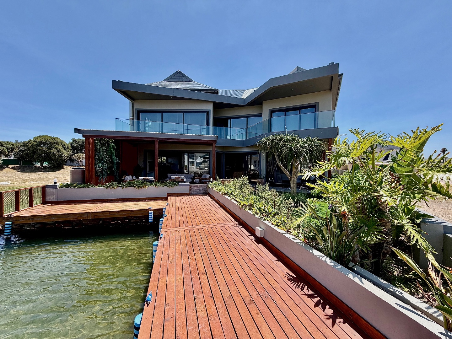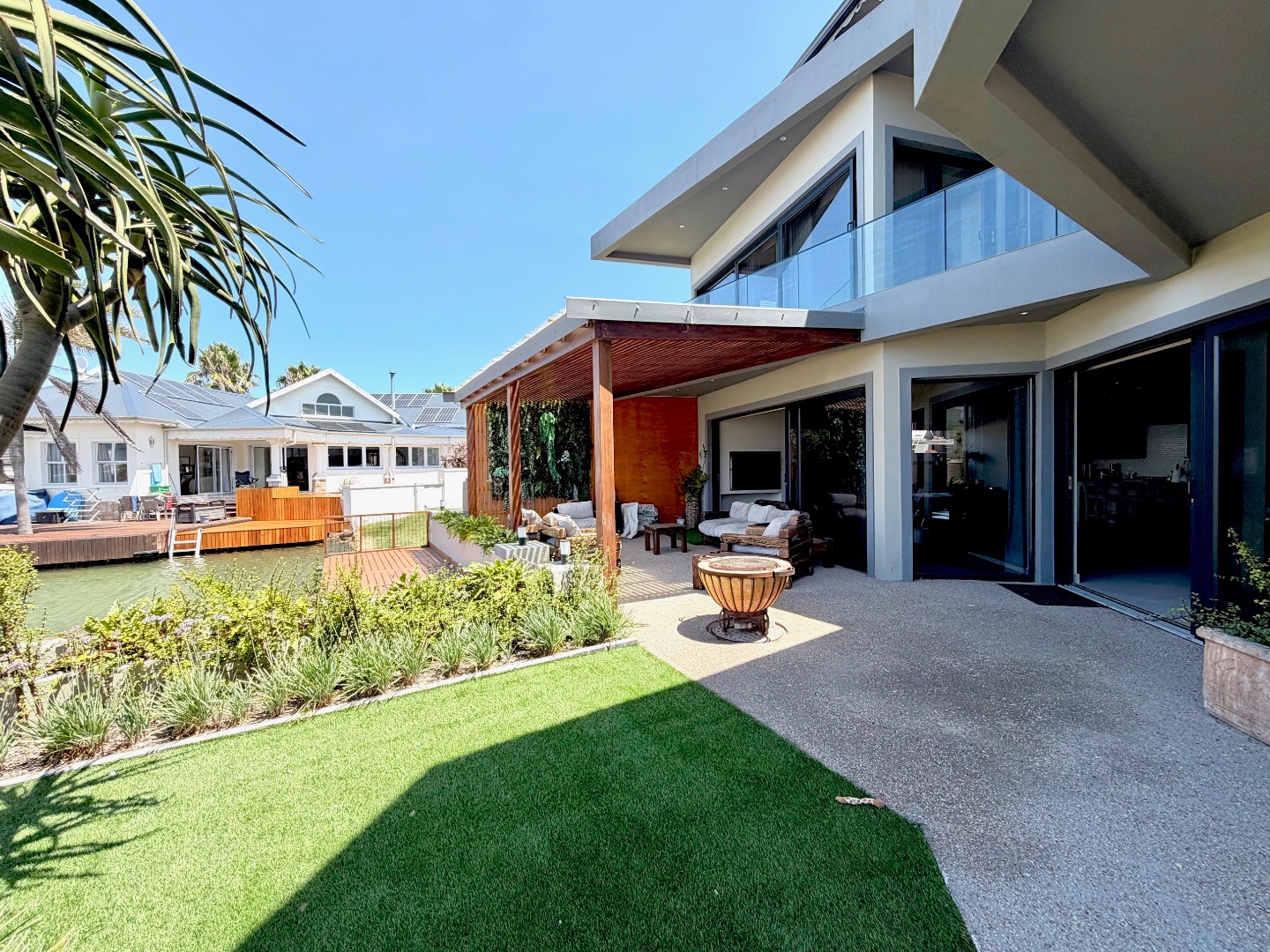 The home offers four generously sized bedrooms, each featuring its own en-suite bathroom, ensuring comfort and privacy for all residents. An additional guest toilet provides convenience. Outdoor living is a highlight, with a private wooden deck offering direct canal access, perfect for aquatic activities. Multiple balconies and a covered patio with a built-in braai provide ample space for entertaining and enjoying scenic views. The property also includes a garden.