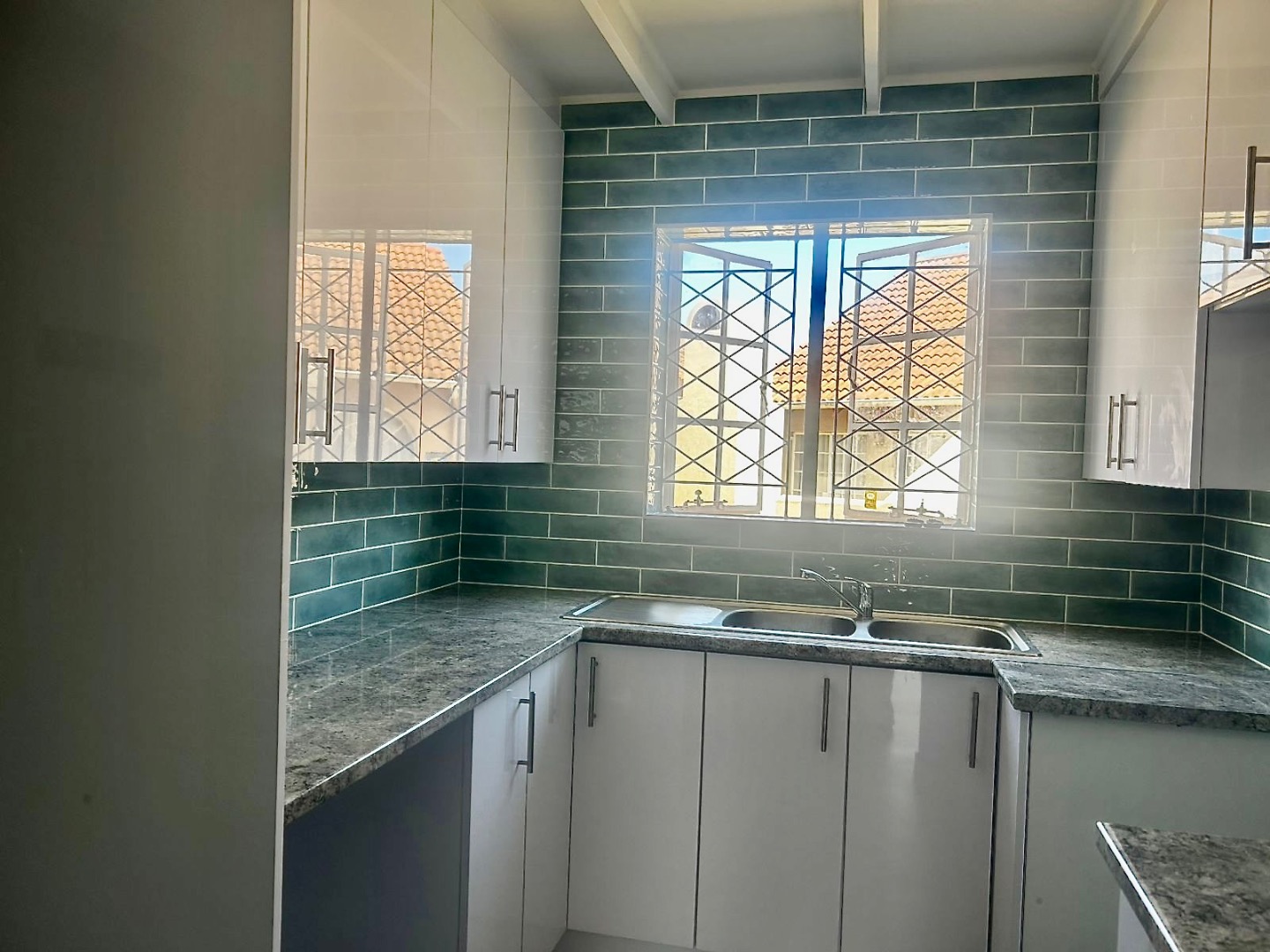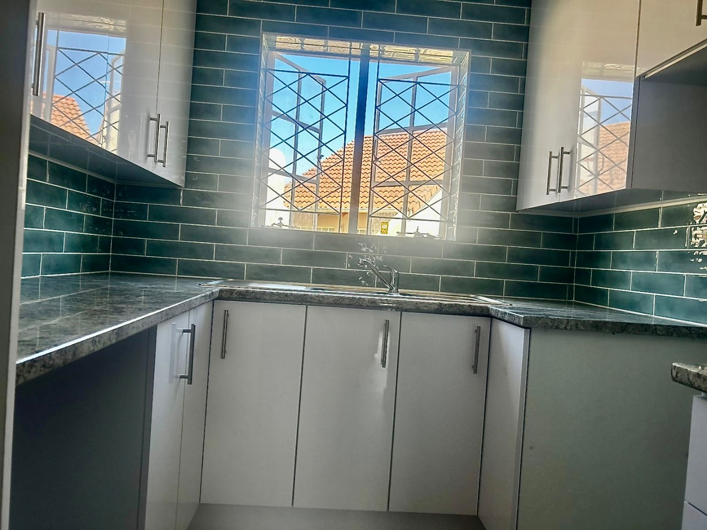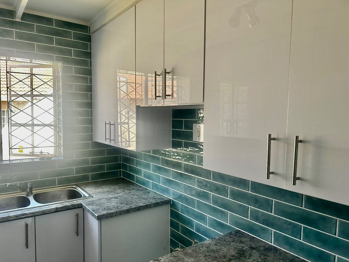 The heart of this home features a modern kitchen, complete with sleek glossy white cabinetry, stylish dark green subway tile backsplash, and durable granite-style countertops. It’s a perfect spot for whipping up delicious meals. The lounge area flows seamlessly, offering a comfortable space for relaxation. You'll also find a fantastic built-in braai, ideal for entertaining friends and family, making those South African summer evenings even more special.