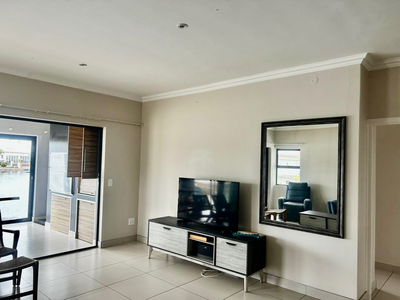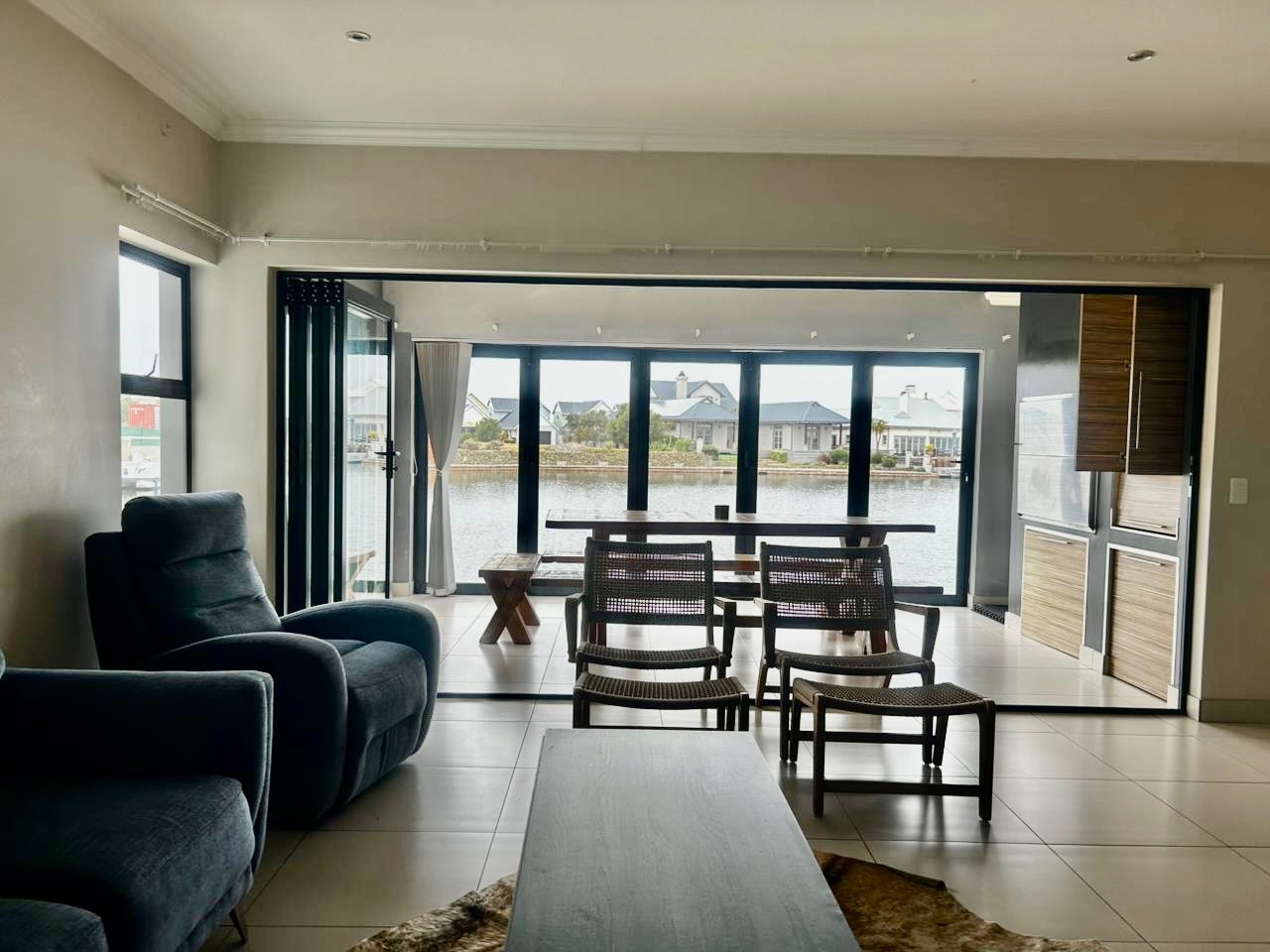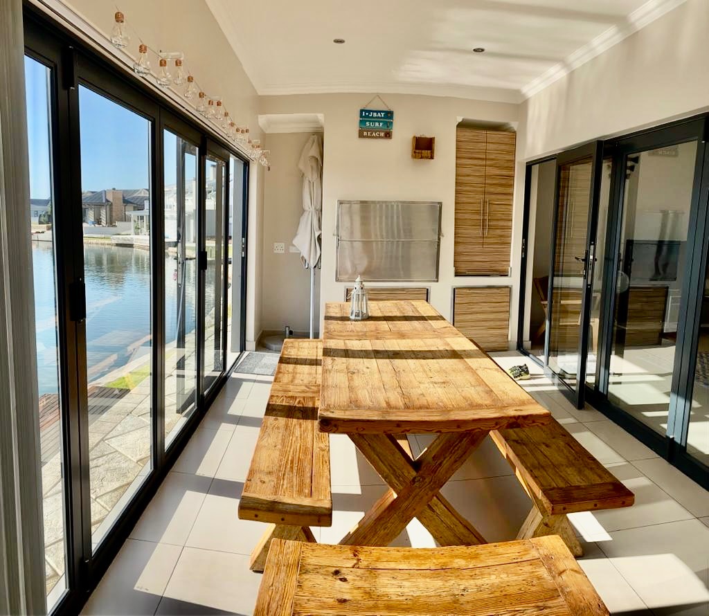 The contemporary kitchen is well-appointed with two-tone cabinetry, an integrated oven, microwave, and gas hob, catering to all your culinary needs. The spacious lounge and dining areas extend effortlessly to an outdoor deck, providing direct canal access and stunning waterfront views. This outdoor space is perfect for entertaining, complete with a built-in braai and ample room for a large dining set, fostering an ideal indoor-outdoor flow.